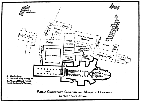 Of the earlier buildings dating back to Roman times there are now no remains. What you see today represents work carried out between the llth and 16th centuries almost entirely. From then until now there has been little or no new construction, though repairs and alterations there have been many. Perhaps the most significant of these in modern times is the beautiful cathedral library. This is perhaps one of the finest collection of records in the world housed in the most up to date conditions of the highest dignity. The cathedral library was destroyed by enemy action on 1st June 1942 when it received a direct hit from a German bomb. Fortunately practically all the valuable archives had been placed in other repositories for their safety and such books as remained were nearly all recovered from the ruins where they had been protected to a great extent by the backs of their heavy cases as these fell inwards and were covered by masonry and rubble from the roof. A few days later salvage began and to the relief of the Dean and Chapter the total losses were relatively few. This however is a digression. The cathedral as it now stands besides being the accepted Mother Church of the English communion stands out as a monument to Christian work and teaching in this Country since about the 3rd century or possibly even earlier still. From the ruined remains of the monastic buildings attached to the cathedral we see how the sick were cared for and learning developed in accordance with Christ's teaching under the auspices of the Church. This is interesting when we compare these things with our own times and how bit by bit the Church has decentralised many of its earlier responsibilities to the State as it has developed under lay Christian leadership. From the sketch plan of the monastic establishment can be seen the buildings of the infirmary, some of the ruins of which are still standing. The cloisters were where the early scholars devoted themselves to their studies sitting at rude desks to execute so many of the old manuscripts from which we are able to gather our information of the past and base our philo- sophies tor the future. The "dorters'" are where the monks and brothers slept and from their size we can well imagine the size of the community who comprised such an establishment. The picturesque water tower in Norman architecture reminds us that in those early days water was "laid on" so to speak. The water was brought to the cathedral by an aquaduct and piped to different spots in lead pipes some of which are still in use. The chapter house, or cathedral office, is where the cathedral authorities met to conduct their business both religious and secular under their principal the prior (later the dean). There were many activities in such an establishment, besides the ecclesiastical duties of the church, amongst which were the preparation of medicines and wines, the maintenance of the buildings and their furnishings, the care of the sick and the aged and the training of men for the ministry. From the beginning such an establishment was in fact a model town centering all its activities on the church with the "Master" as its head. Of the cathedral church itself much has been written, one pecularity is at least worthy of notice. It will be observed that the chancel and eastern portion of the building are slightly out of line with the nave and the main body of the church. This was a plan adopted by the early church builders to depict Our Lord as hanging upon the cross with head inclined to the right and out stretched arms. The central tower carries the bells and was so placed that when the peal rang out hearers might call to mind the heart beats of the Saviour as He hung upon the tree calling all men to Him saying "Father forgive them, for they know not what they do." There are many tombs and monuments about the building but probably every visitor will want to know where Thomas-a- Becket is buried. Today nothing remains to mark the site where once stood perhaps the most gorgeously decorated shrine the world has ever known at which kings, princes, priests and beggars have done pilgrimage. By order of King Henry VIII in 1338 the whole was obliterated and gold, jewels and precious ornaments were removed the value of which has been computed at many thousands of pounds sterling in the currency and values of those days. Thus today we have no monument to show where fell an archbishop at the hands of four knights filled with zeal to obey the every thought of their hasty liege lord King Henry II who in a burst of exasperated fury was so foolishly out-spoken as to wish to be rid of so turbulent a priest. The incident occured on 29th December, 1170 on Becket's return to this country from France and whilst the king was out of England. On landing at Sandwich he learned for the first time that the king had instructed the Archbishop of York to perform a coronation ceremony upon his son Henry, so that in fact there were two Kings of England at that date both Henry by name, father and son. This had taken place on 14th June. (This Henry pre- deceased his father). So incensed was Becket that he suspended the Archbishop of York and excommunicated the Bishops of London and Salisbury who had assisted at this illegal and most irregular ceremony. The news of Becket's action soon reached Henry II and the dastardly drama ensued Reginald Fitzurse, Wiiliam de Tracy, Hugh de Morville and Richard Ie Breton came post haste to England and foregathered at Saltwood Castle the country residence of the Archbishop which during his pro- tracted absence on the continent had been seized by Randolf de Broc. Here the plot was laid. Clarenbald, a life long enemy of Becket was Abbot of St. Augustines Abbev in Canterbury and to him the four knights repaired. The news that trouble was afoot reached Beckett's ears in his palace. The monks of the cathedral growing alarmed hastened him to the sanctuary of the church proceeding along the cloisters to 
