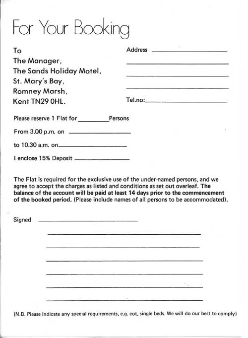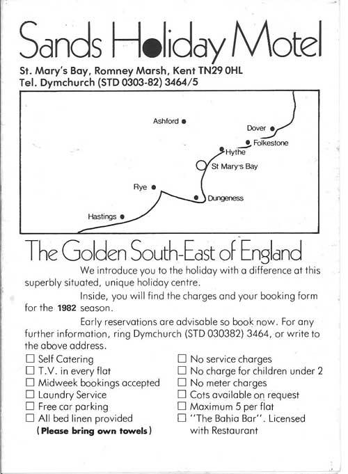Other Villages | Romney Marsh | Romney Hythe & Dymchurch Railway Sands Holiday Motel - St Mary's Bay Brochure for 1982 Season Reproduced below is a copy of the brochure for the 1982 season at the Sands Holiday Motel, the last year that I stayed there. You can't get much for 120 pounds a week today.